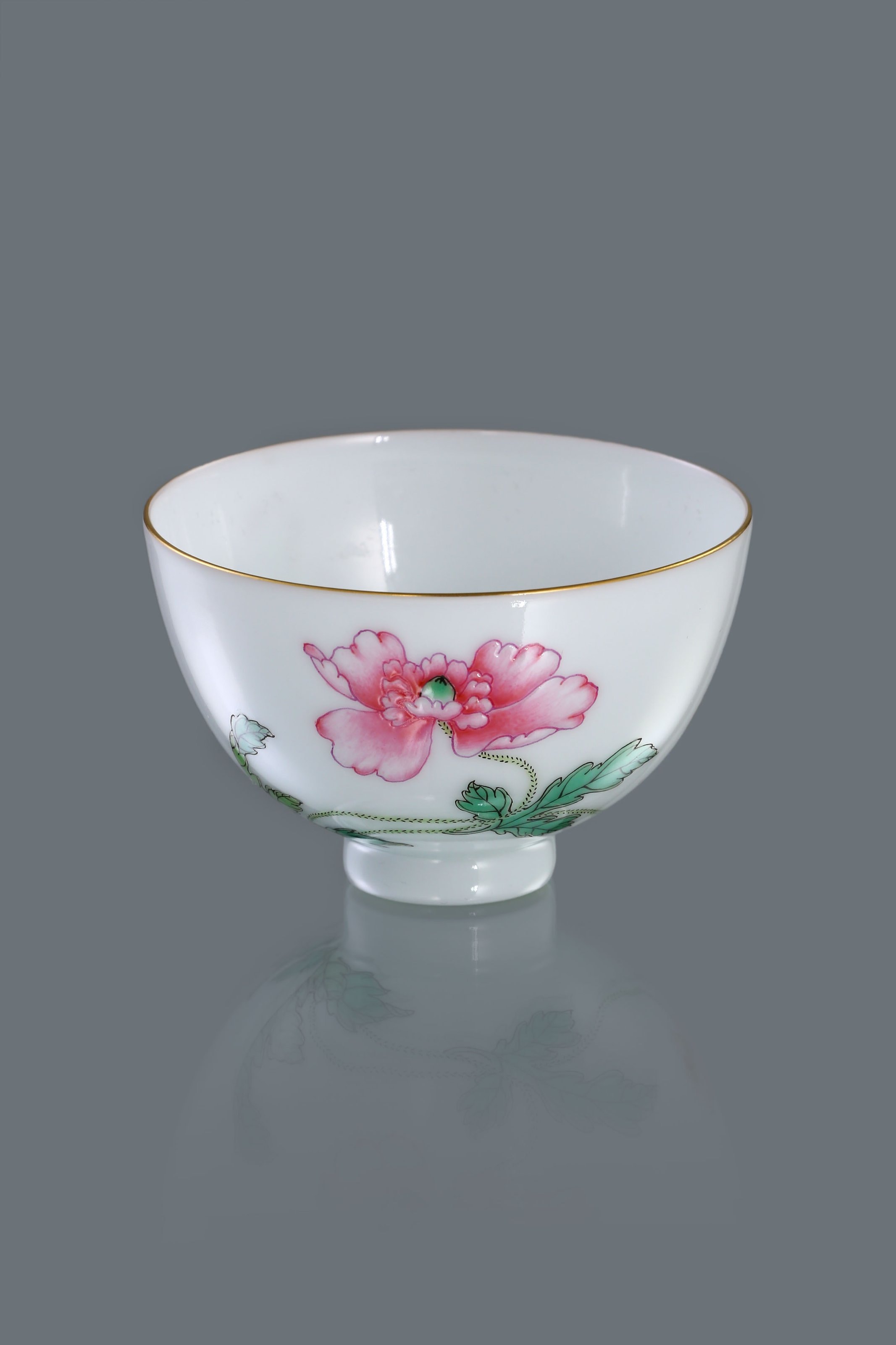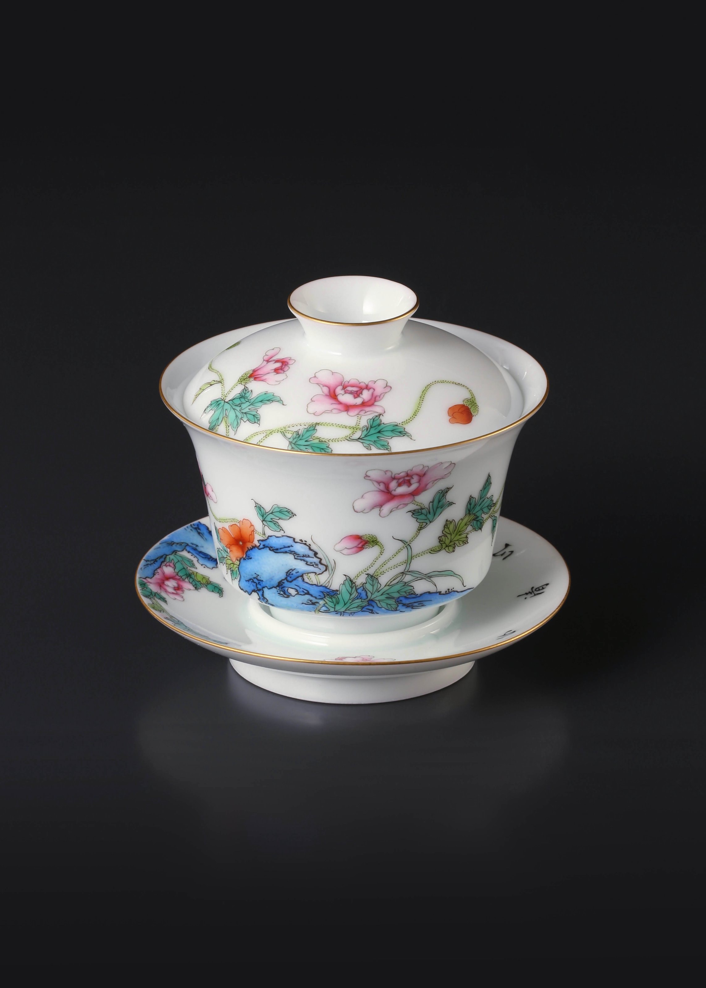虞美人盖碗|茗杯 口直径:9cm (Rim Diameter) 高:8.6cm (Overall height) 容量:140ml (Capacity) 虞美人 高:4.7cm直径口:7.4cm 名花倾国色,和气伴吉祥