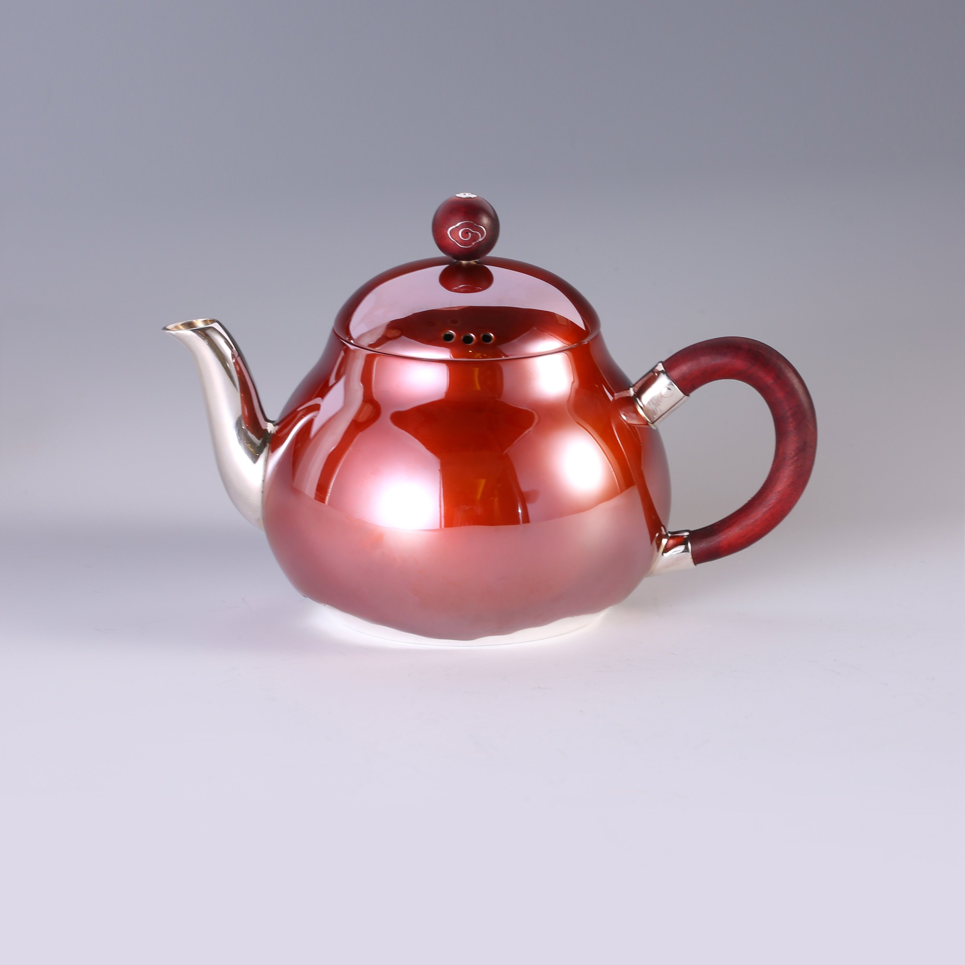 此铜包银梨形壶,造型为康熙、雍正时期的经典形制,梨式也是朱泥壶的最经典的形制,据说是惠孟臣所创,历代皆有所见。极简内敛的线条,每一个线条设计皆为圆的切线,重心偏低,是圆形器中最具稳定性的造型。不喧不哗的光素形制,展现小壶的独特风采。此件小壶流嘴细长含韵,三弯流嘴,粗细均见。