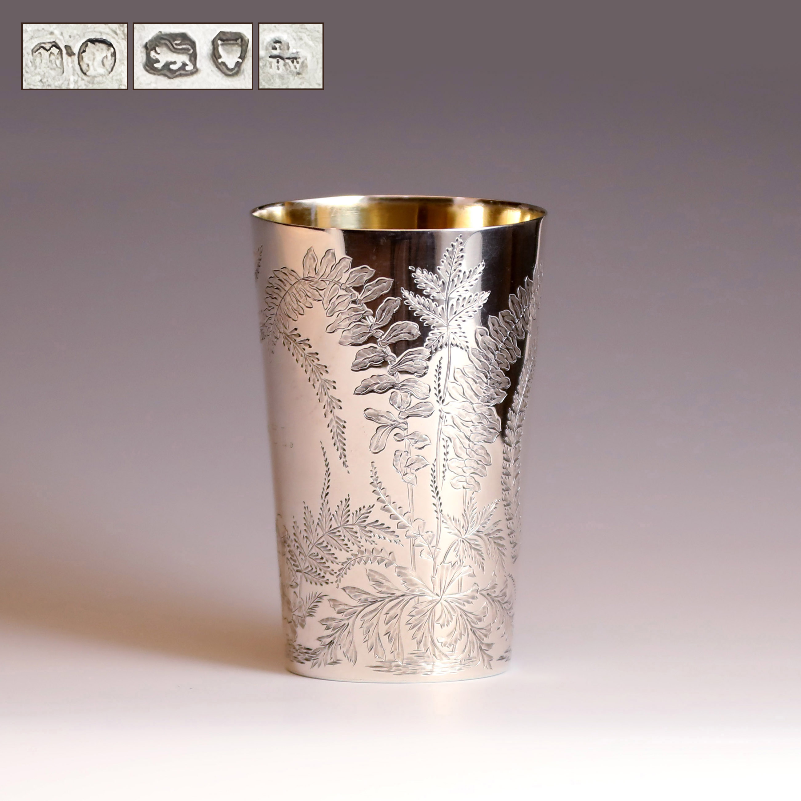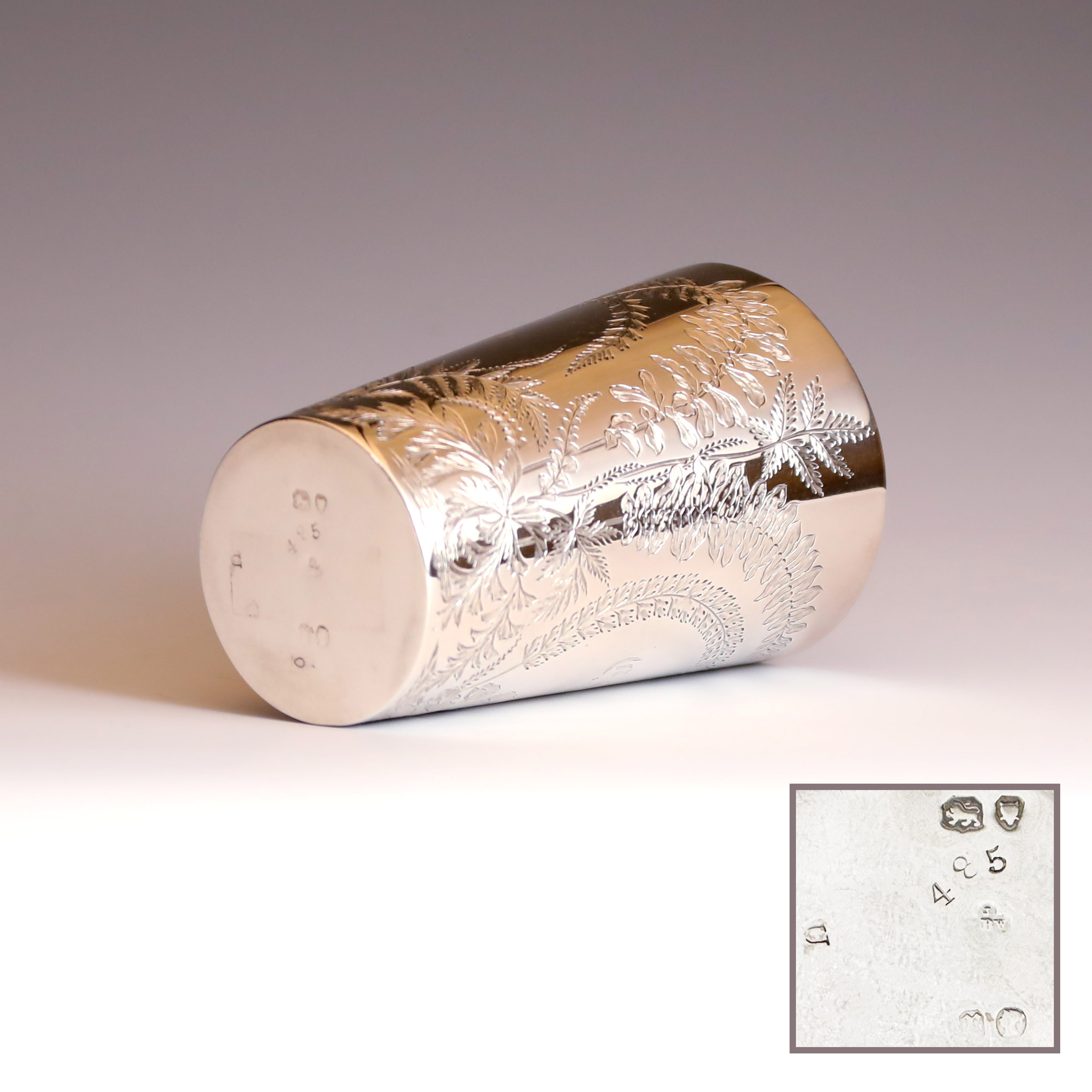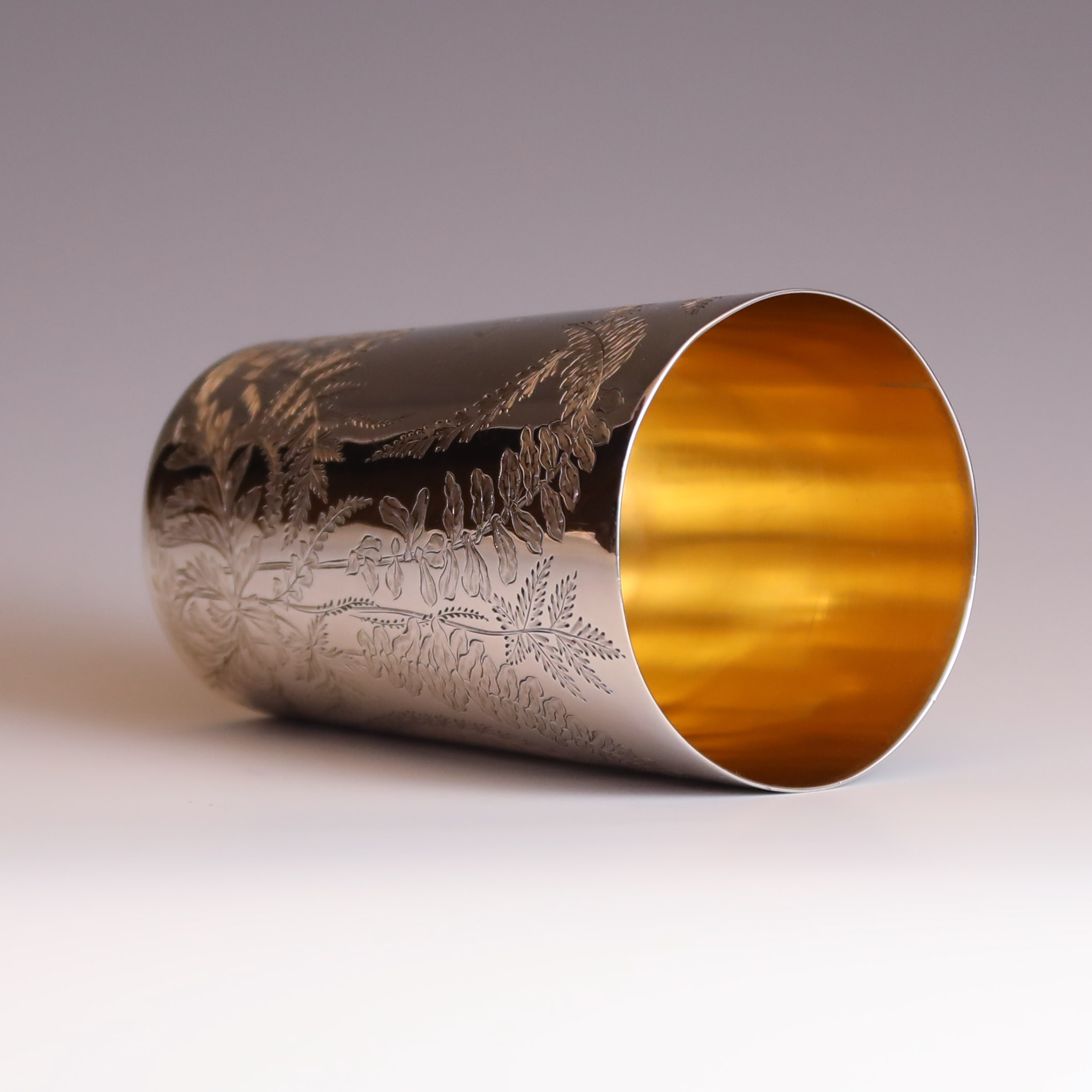 克重:104克高:9cm 口径:5.8cm 1872-1873英国伦敦纯银錾刻内鎏金红茶杯/主人杯/酒杯 银杯斜壁直腹,平底,形制简洁,内部光素鎏金,外壁细錾欧洲经典茛苕叶,繁密有秩,錾刻精细。 茛苕叶在古希腊人眼中象征智慧与艺术,它的尖刺与旺盛的生命力象征“克服人生中诸多障碍”,同时茛苕叶还象征永存。 包 裝