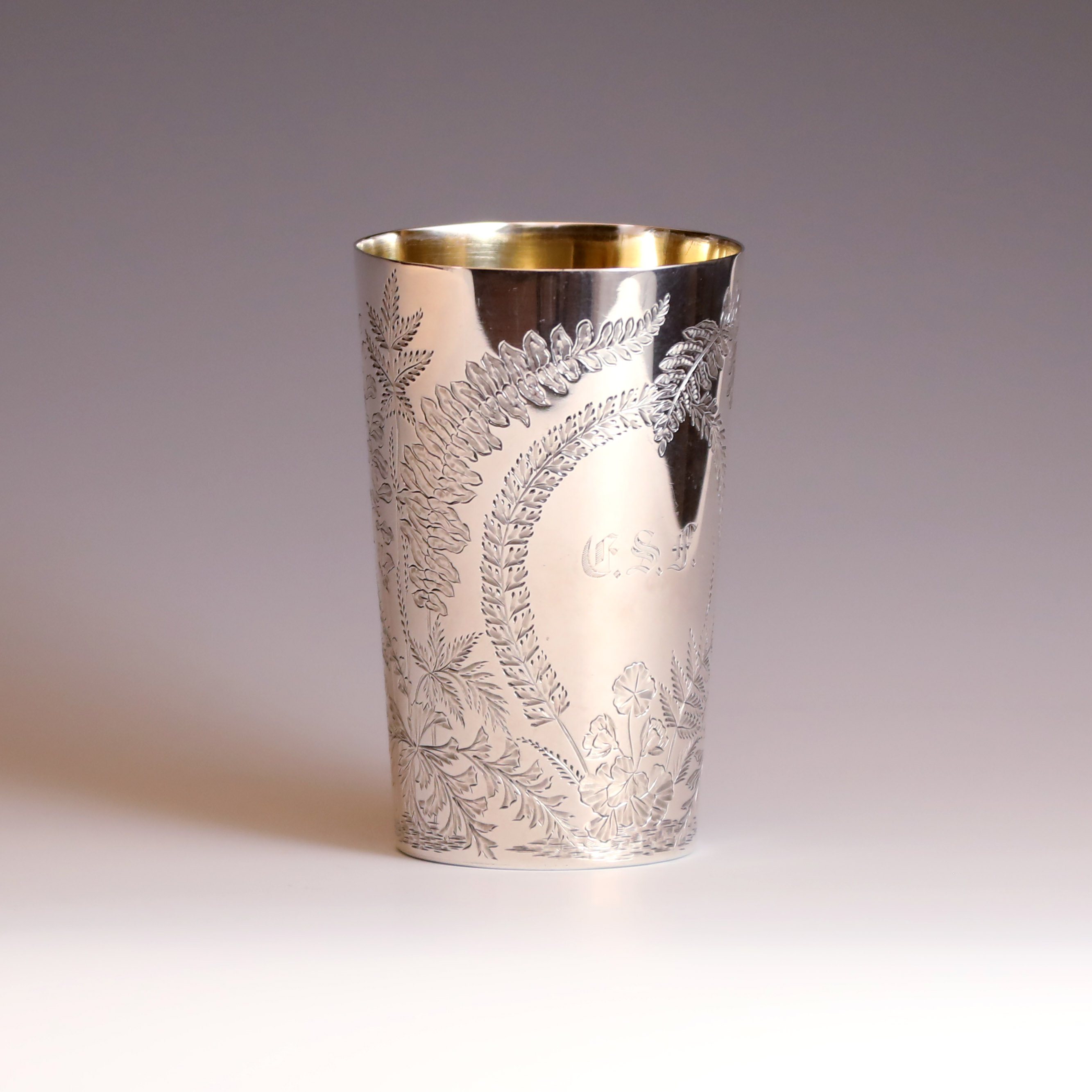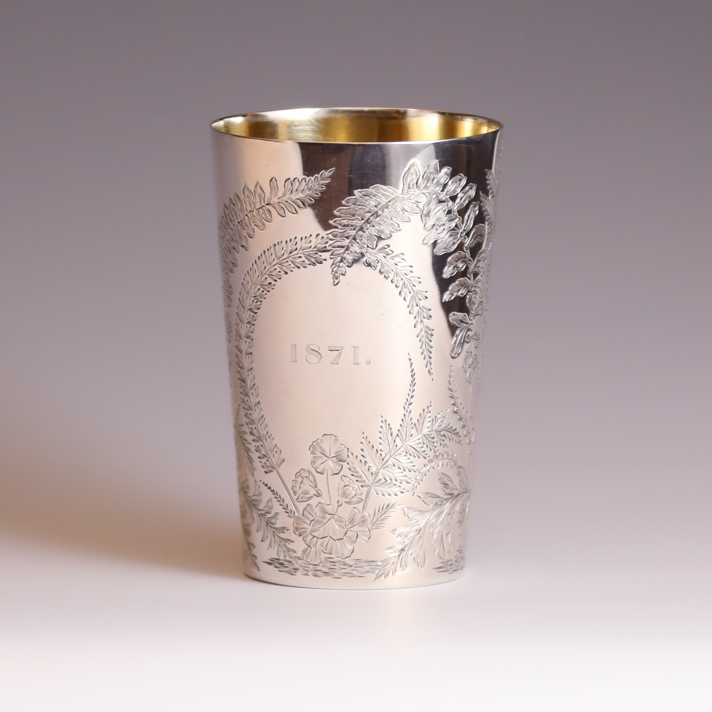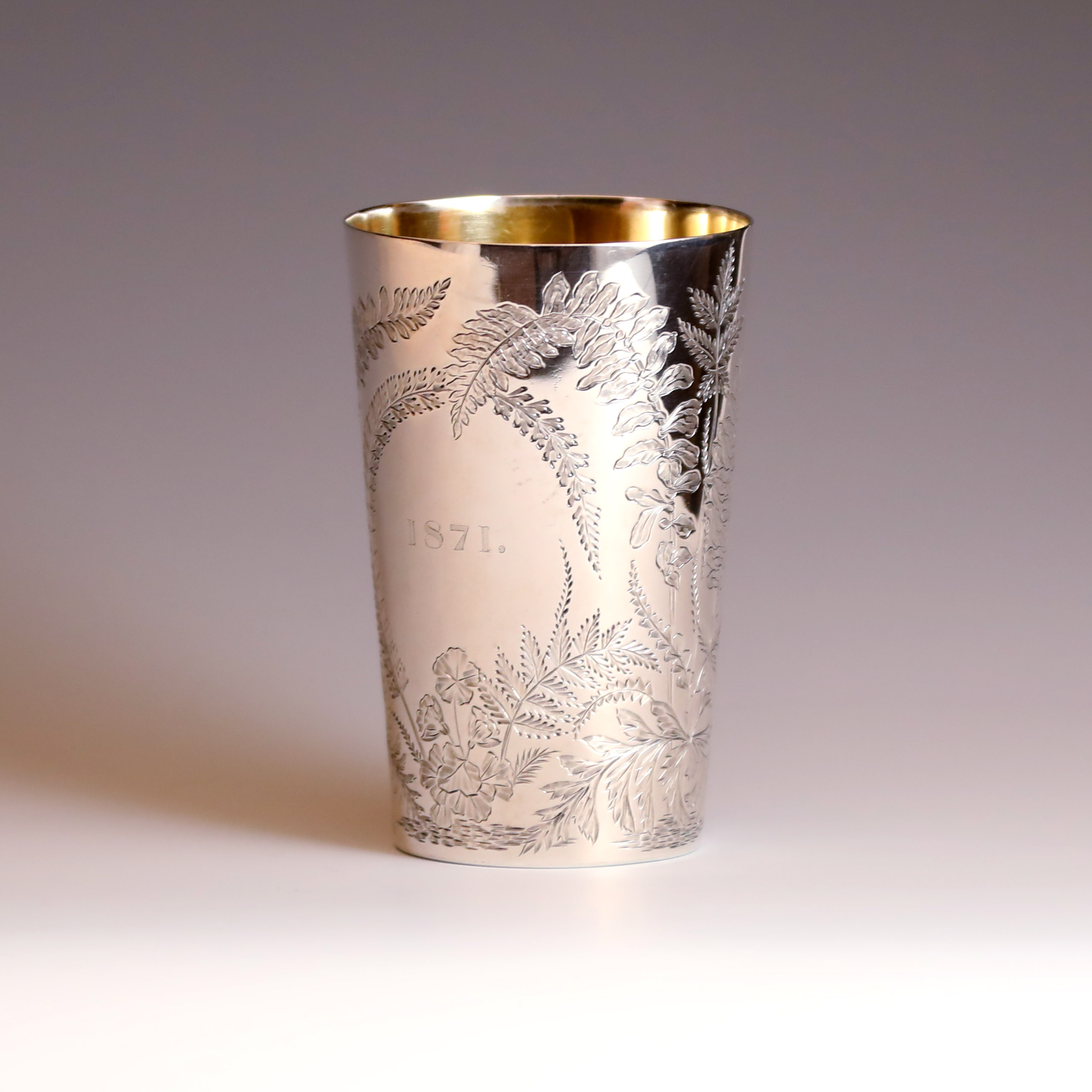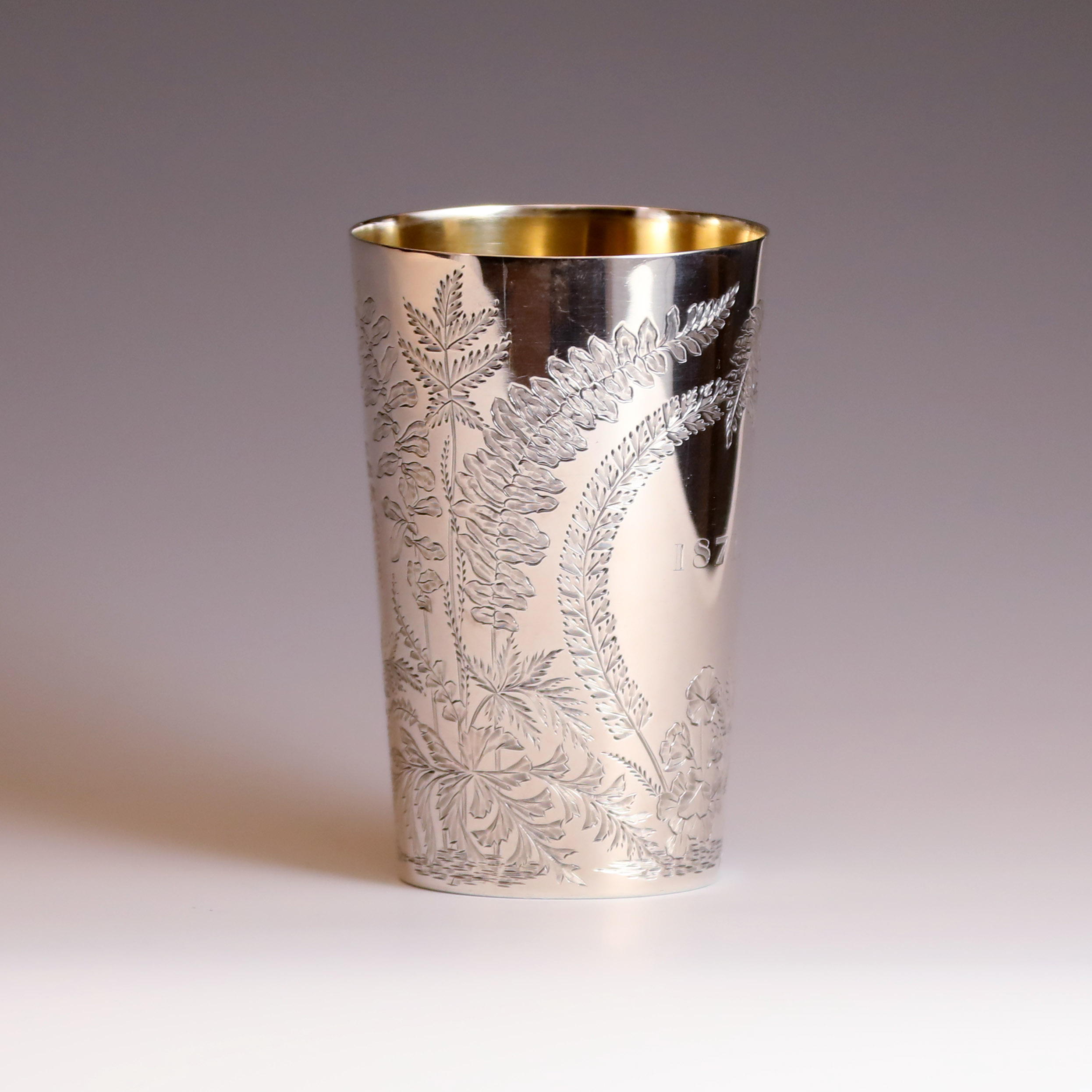 克重:104克高:9cm 口径:5.8cm 1872-1873英国伦敦纯银錾刻内鎏金红茶杯/主人杯/酒杯 银杯斜壁直腹,平底,形制简洁,内部光素鎏金,外壁细錾欧洲经典茛苕叶,繁密有秩,錾刻精细。 茛苕叶在古希腊人眼中象征智慧与艺术,它的尖刺与旺盛的生命力象征“克服人生中诸多障碍”,同时茛苕叶还象征永存。 包 裝