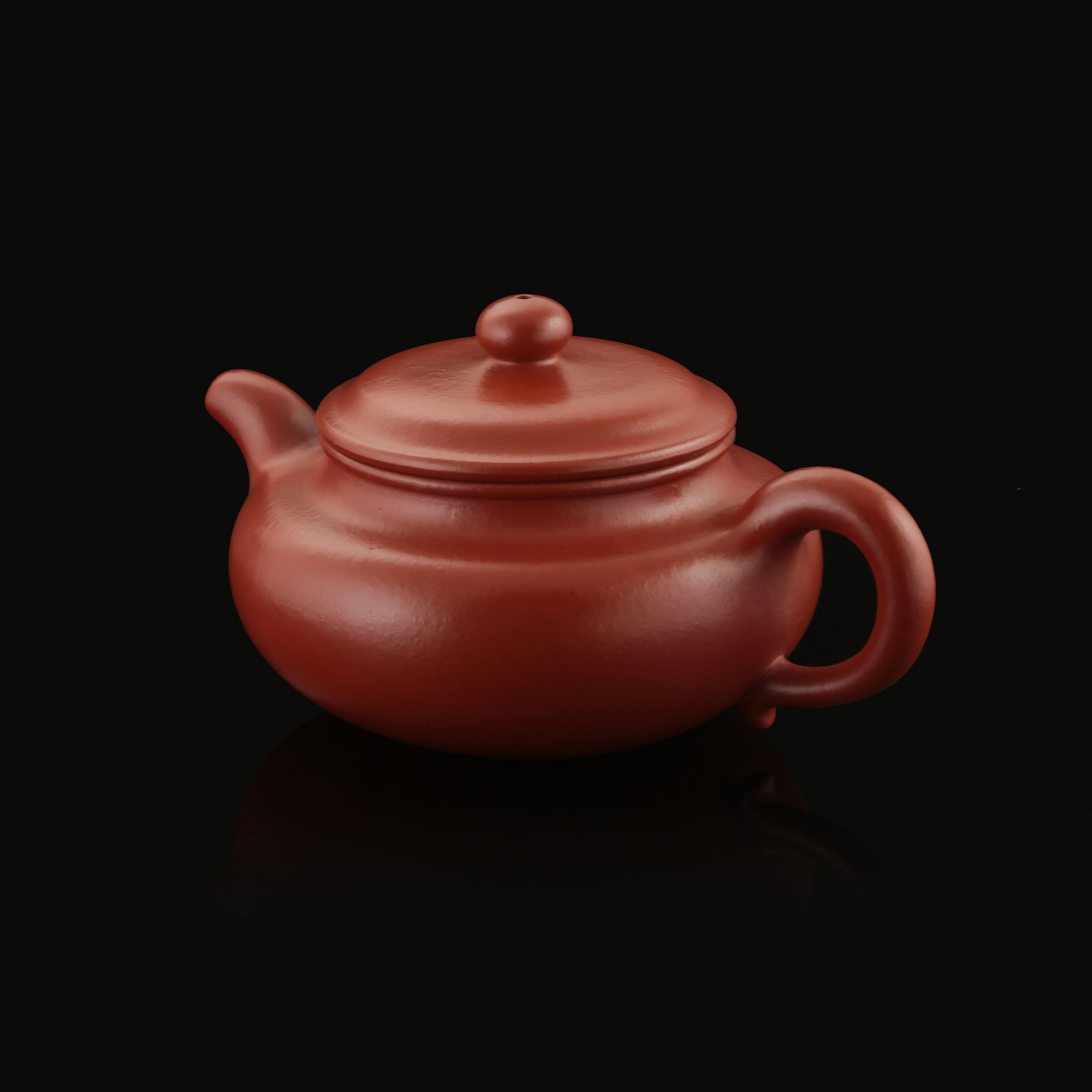 仿古壶 材质:小煤窑朱泥 容量:220ml 仿古壶由来: 一说清代邵大亨初创,原意是壶体仿照鼓型,后人仿制做这种壶形就成了仿古代壶型的意思了。另说最早见于近代赵松亭按吴大徴授意所作,身扁、腹鼓、颈高、盖板平滑,壶盖与口沿子母线吻合严密,合成圆线饱满。