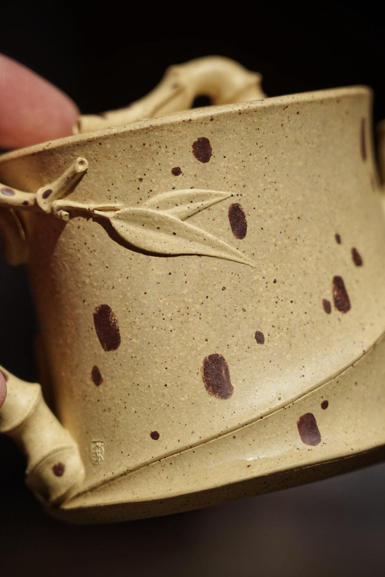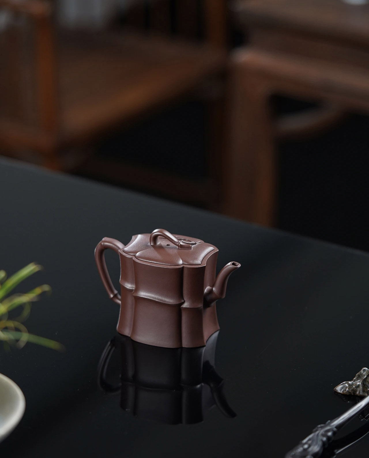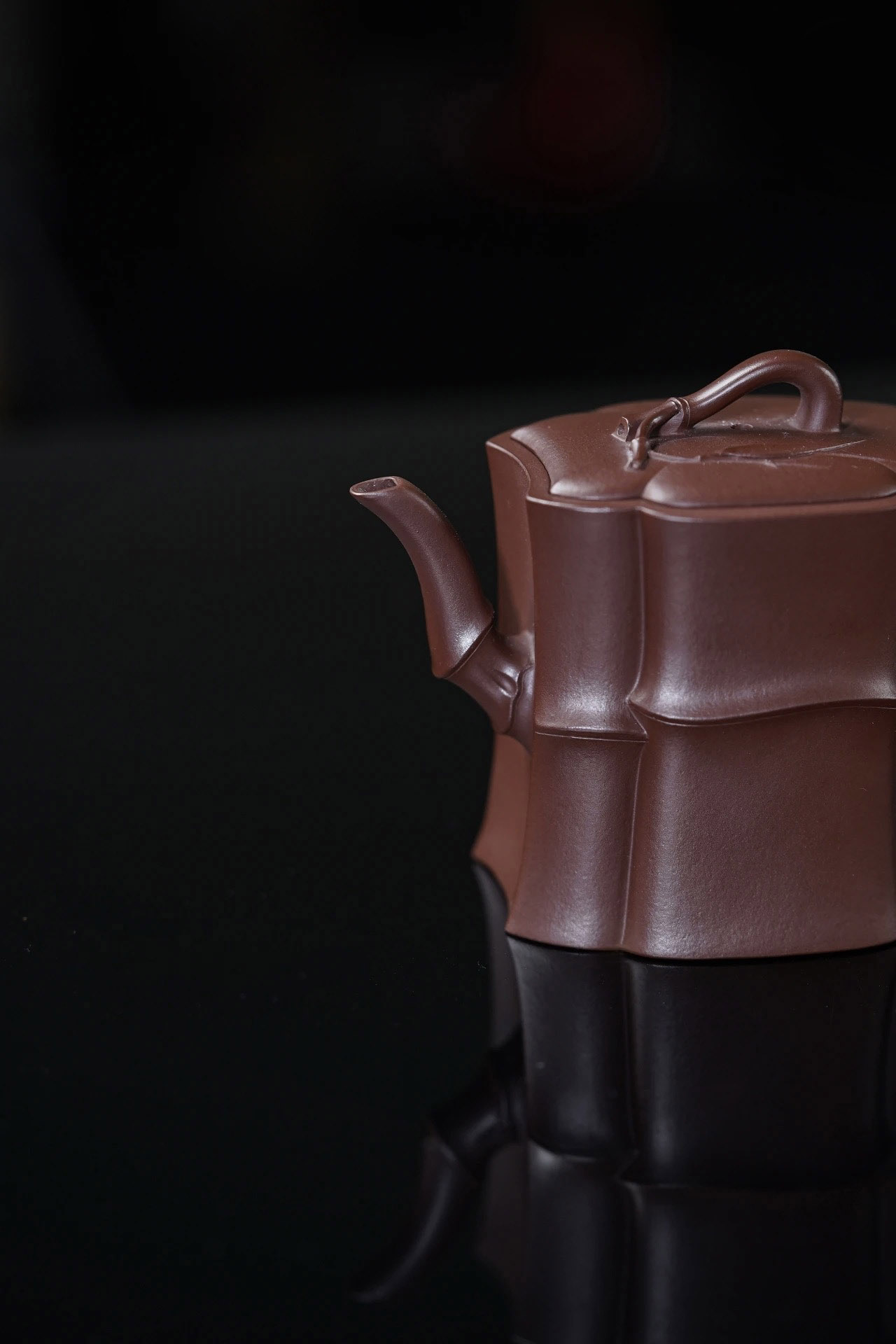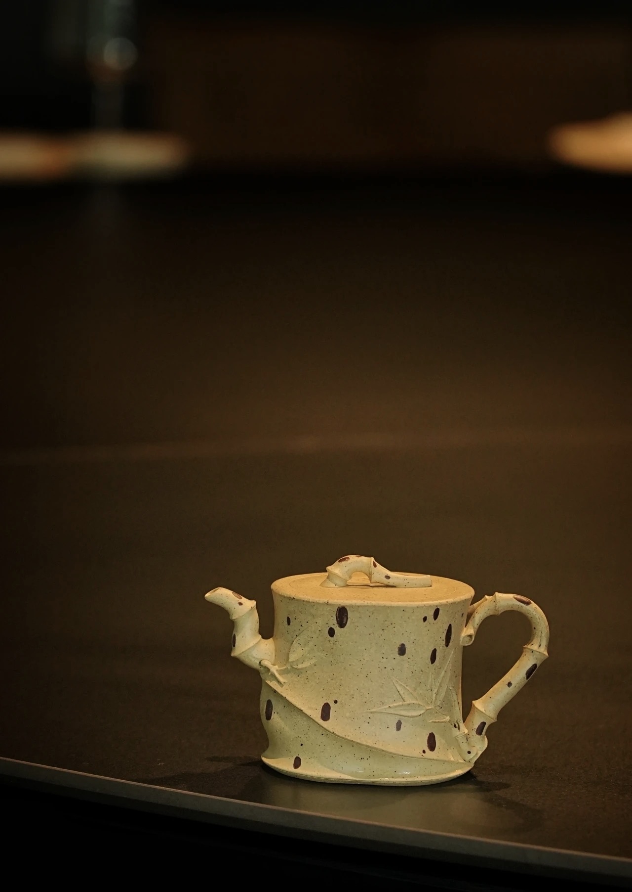 清雅隽秀,风骨飘逸。挺拔直流嘴,塑竹节,竹段为壶把。上塑扭曲竹节为壶钮。竹节曲度协调得体。胎薄泥细,斑纹疏密有致,一丝一扣,处处精到,浑若天成,生趣盎然。