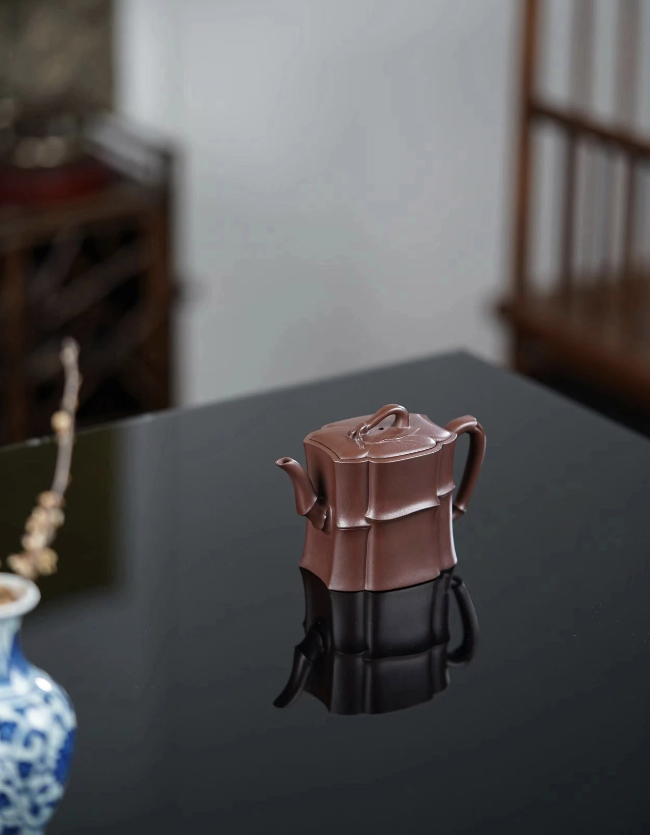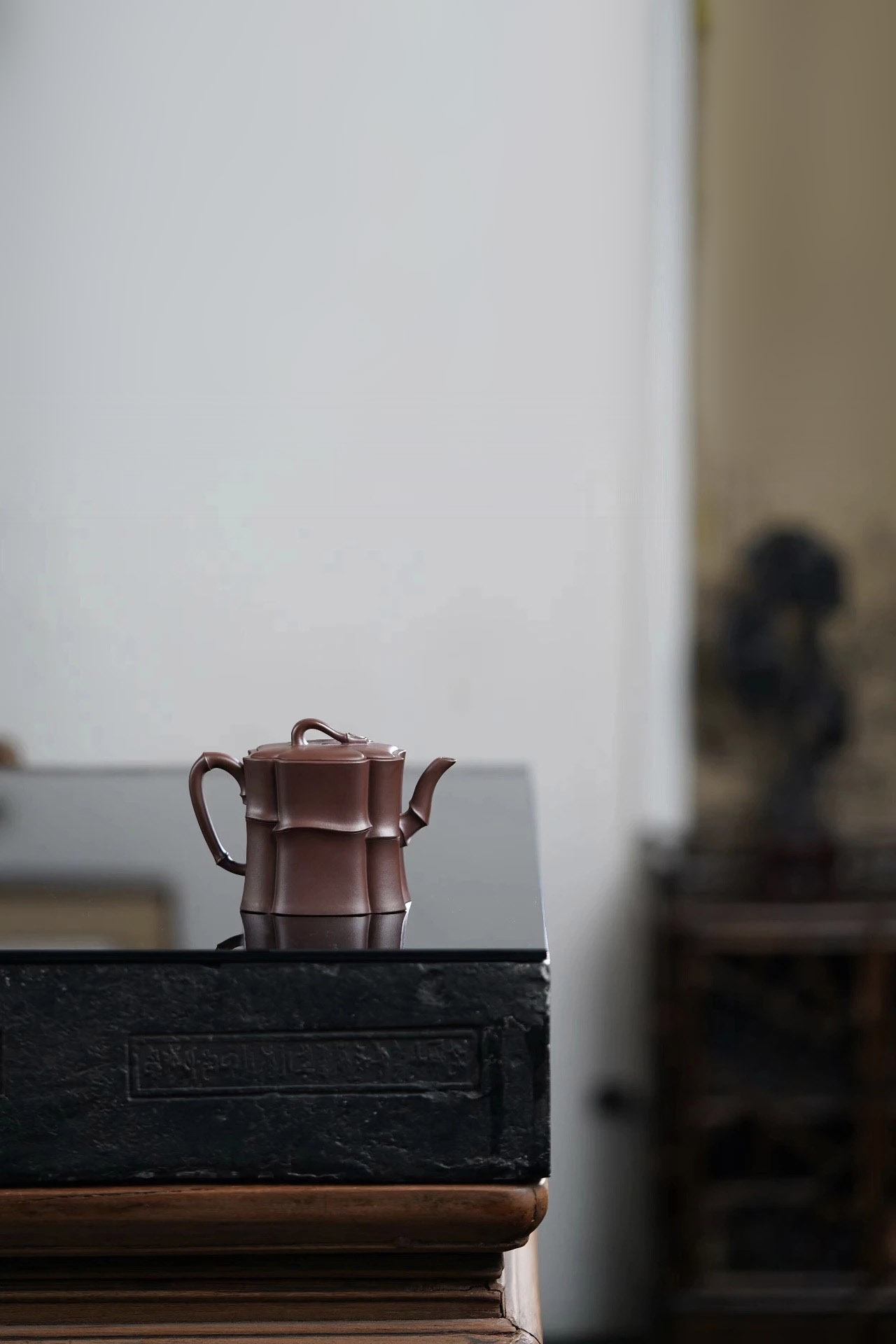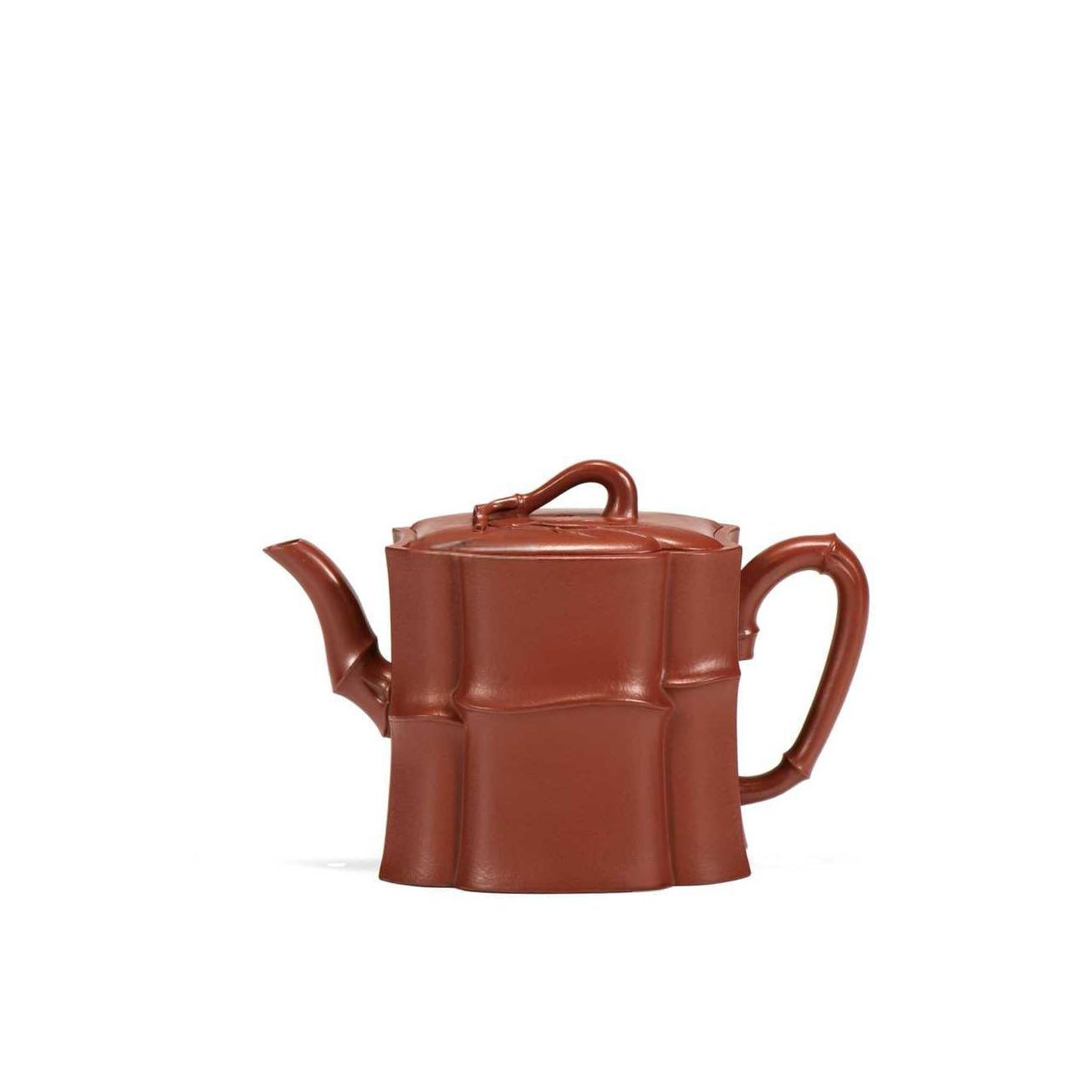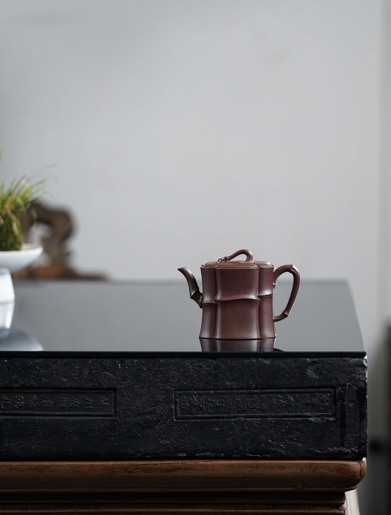清雅隽秀,风骨飘逸。挺拔直流嘴,塑竹节,竹段为壶把。上塑扭曲竹节为壶钮。竹节曲度协调得体。胎薄泥细,斑纹疏密有致,一丝一扣,处处精到,浑若天成,生趣盎然。