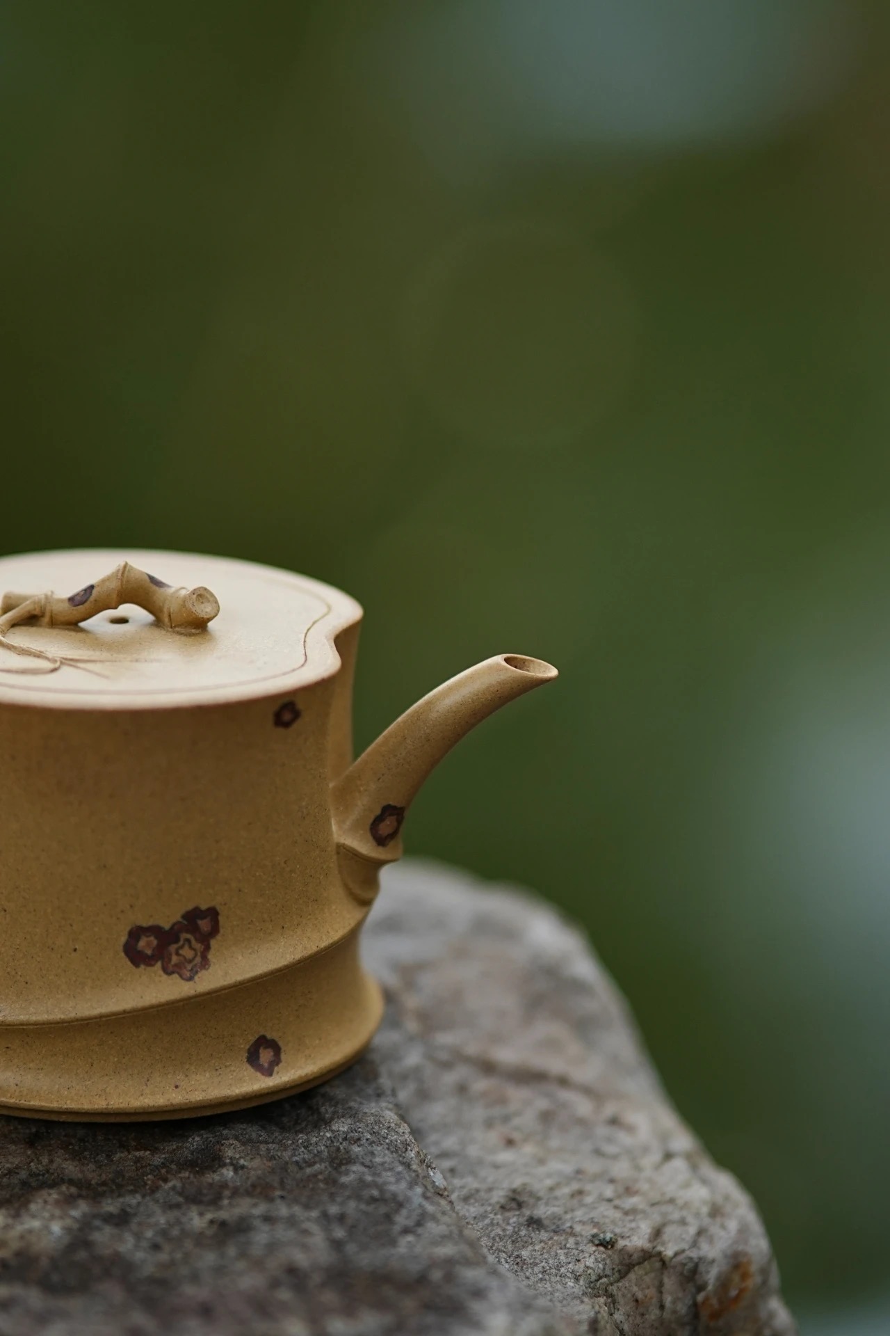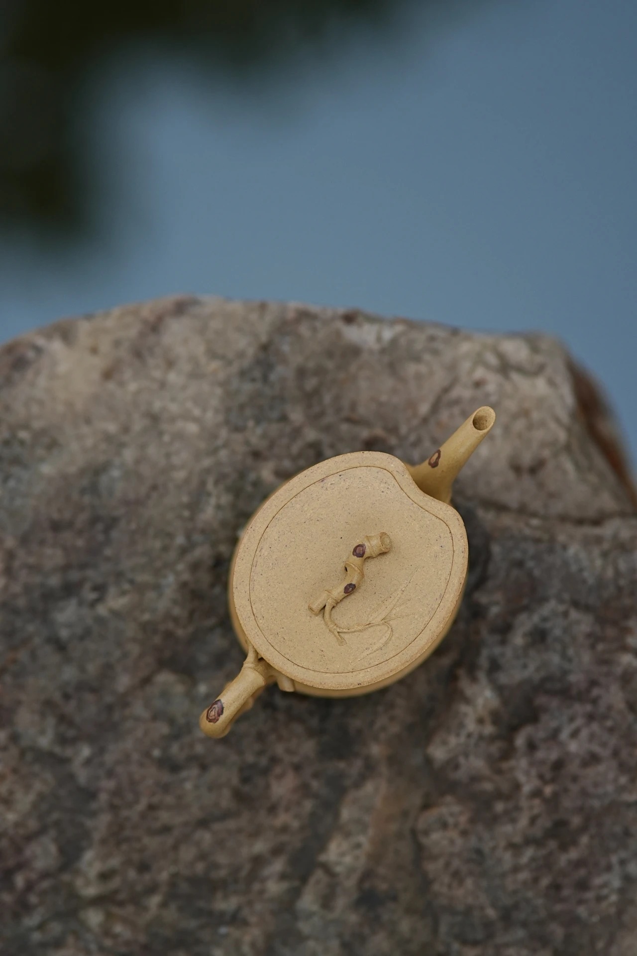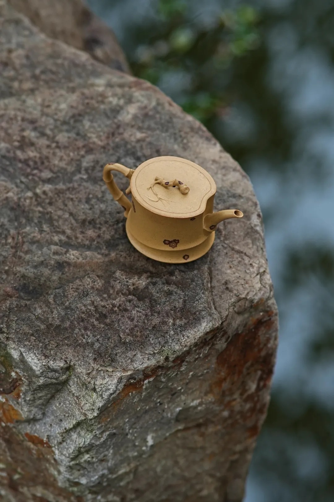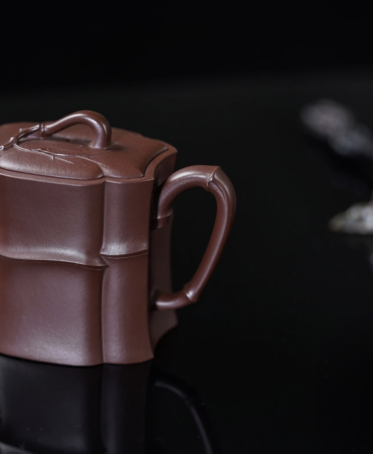 清雅隽秀,风骨飘逸。挺拔直流嘴,塑竹节,竹段为壶把。上塑扭曲竹节为壶钮。竹节曲度协调得体。胎薄泥细,斑纹疏密有致,一丝一扣,处处精到,浑若天成,生趣盎然。
