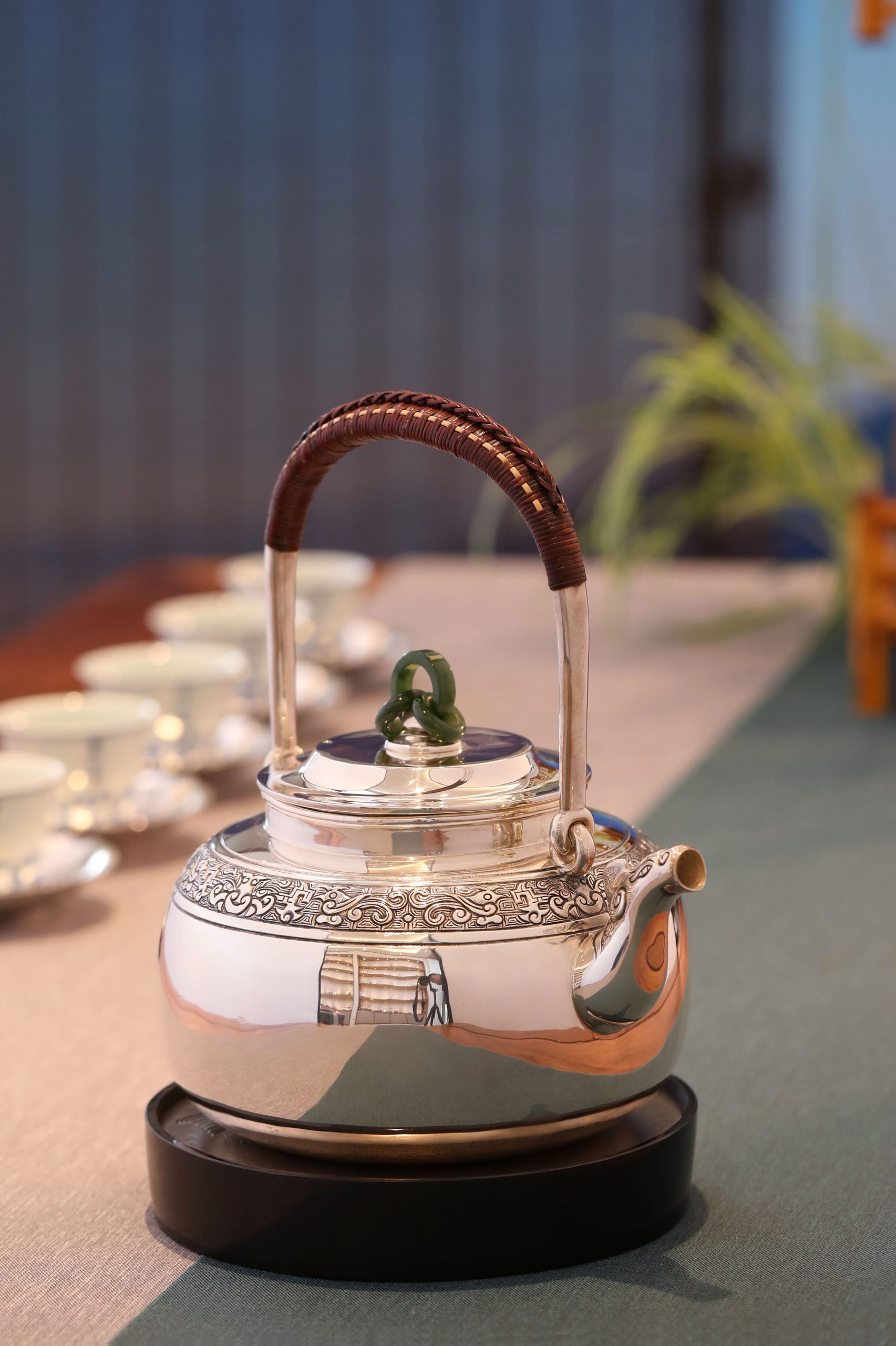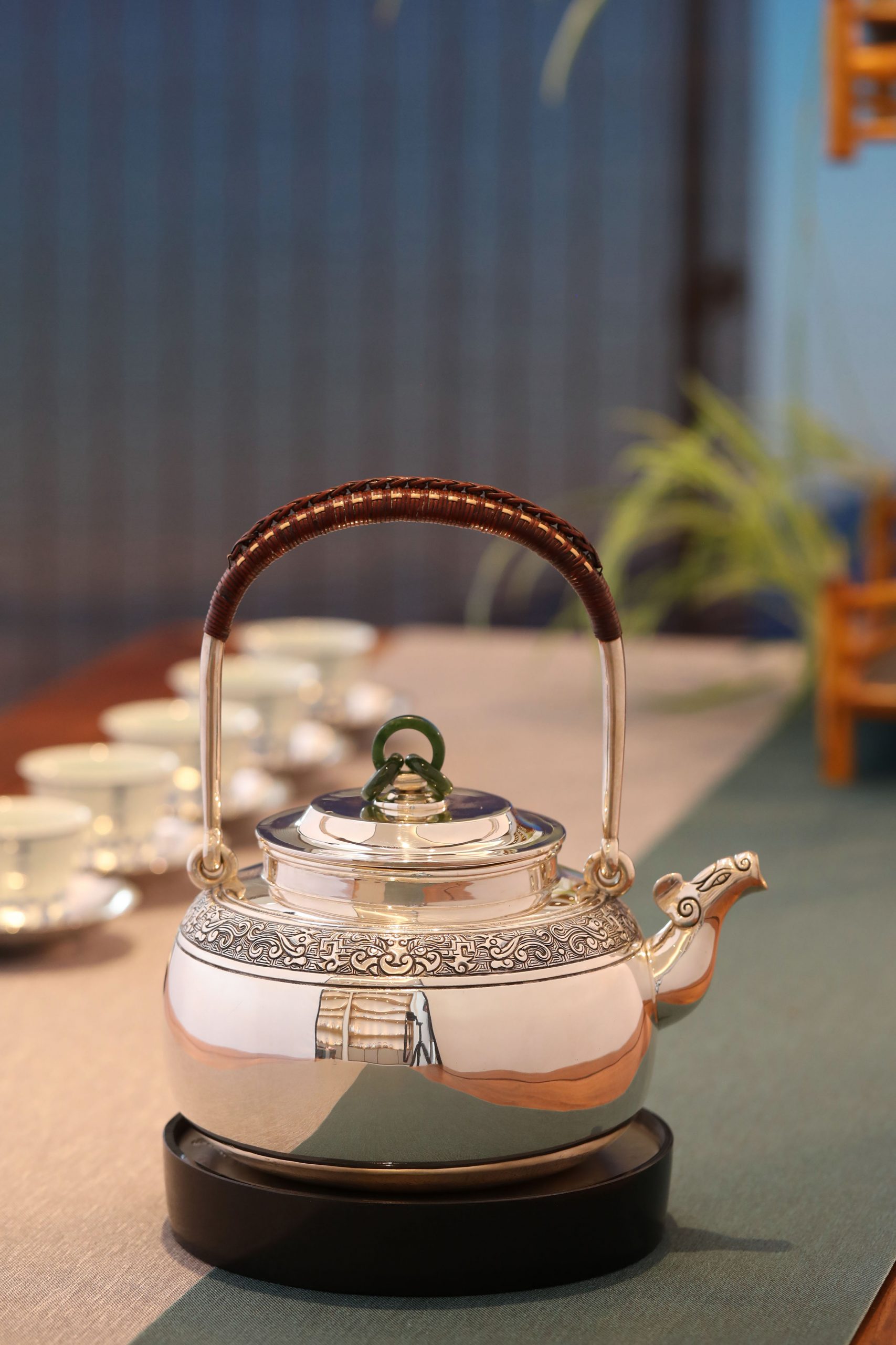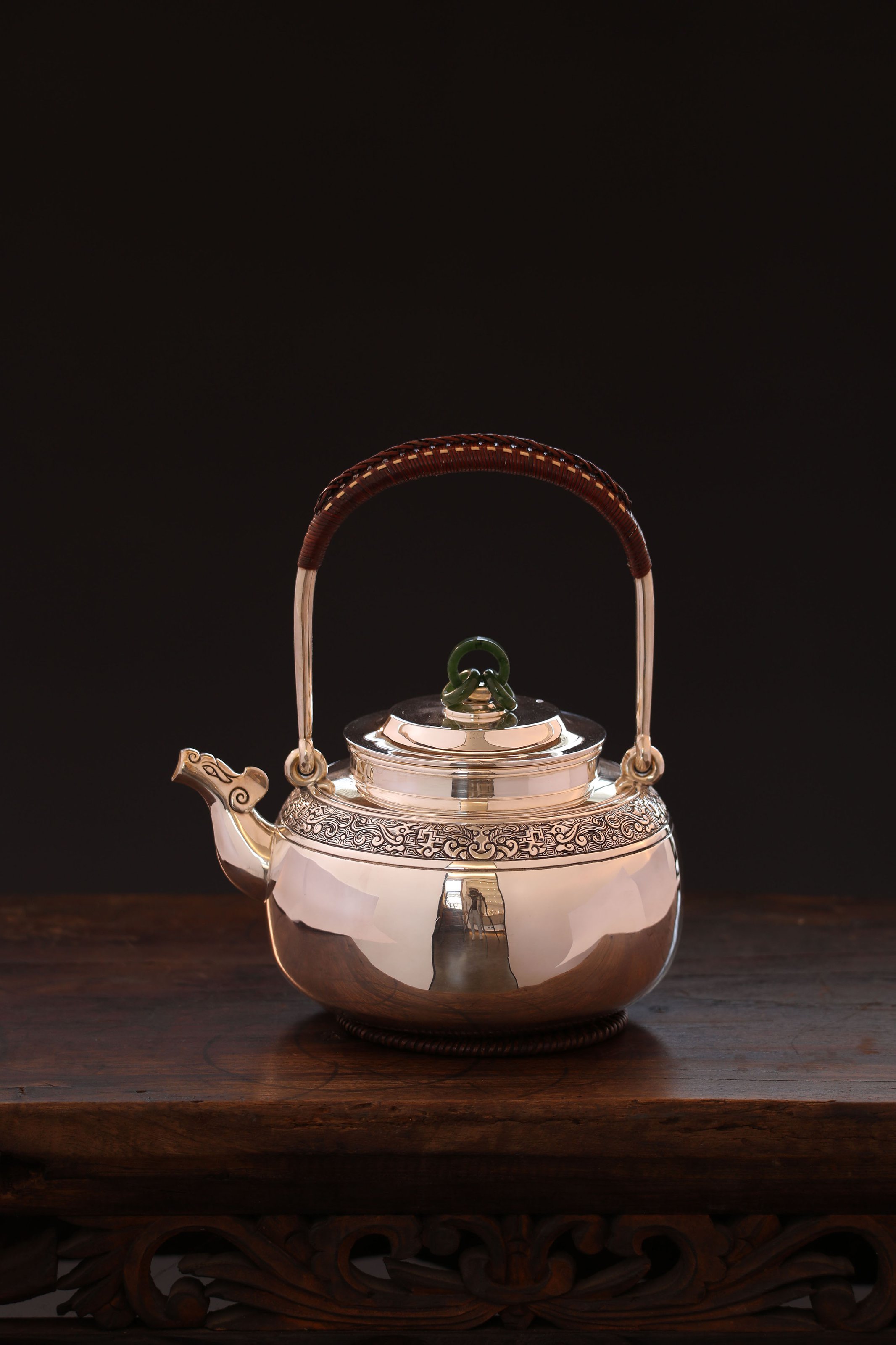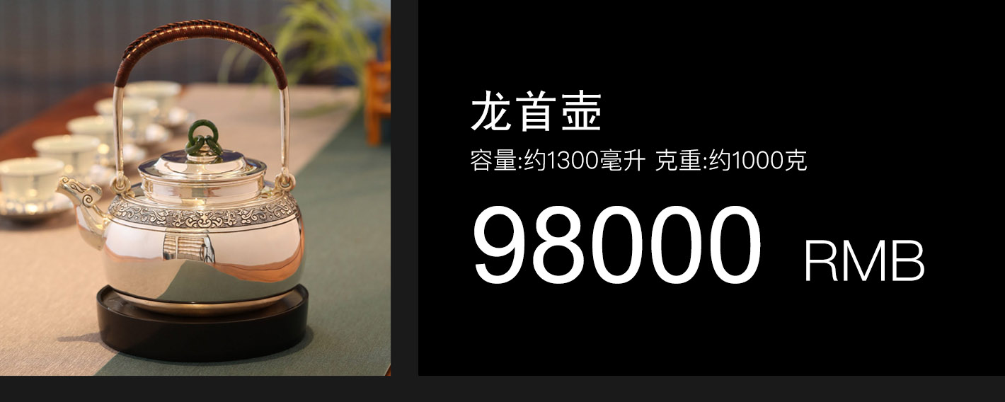 大雅堂出品 纯手工制作。非遗传人李福明代表作。 龙首壶 容量:约1300毫升 克重:约1000克 兽首造型源于春秋战国青铜器,也是最传统的中国纹样。此壶三环玉摘,老藤编把。壶身錾刻精湛,回纹为地,衬托出古雅神鸟纹样。整体造型古韵,雄浑恢弘。大雅堂出品 纯手工制作。非遗传人李福明代表作。