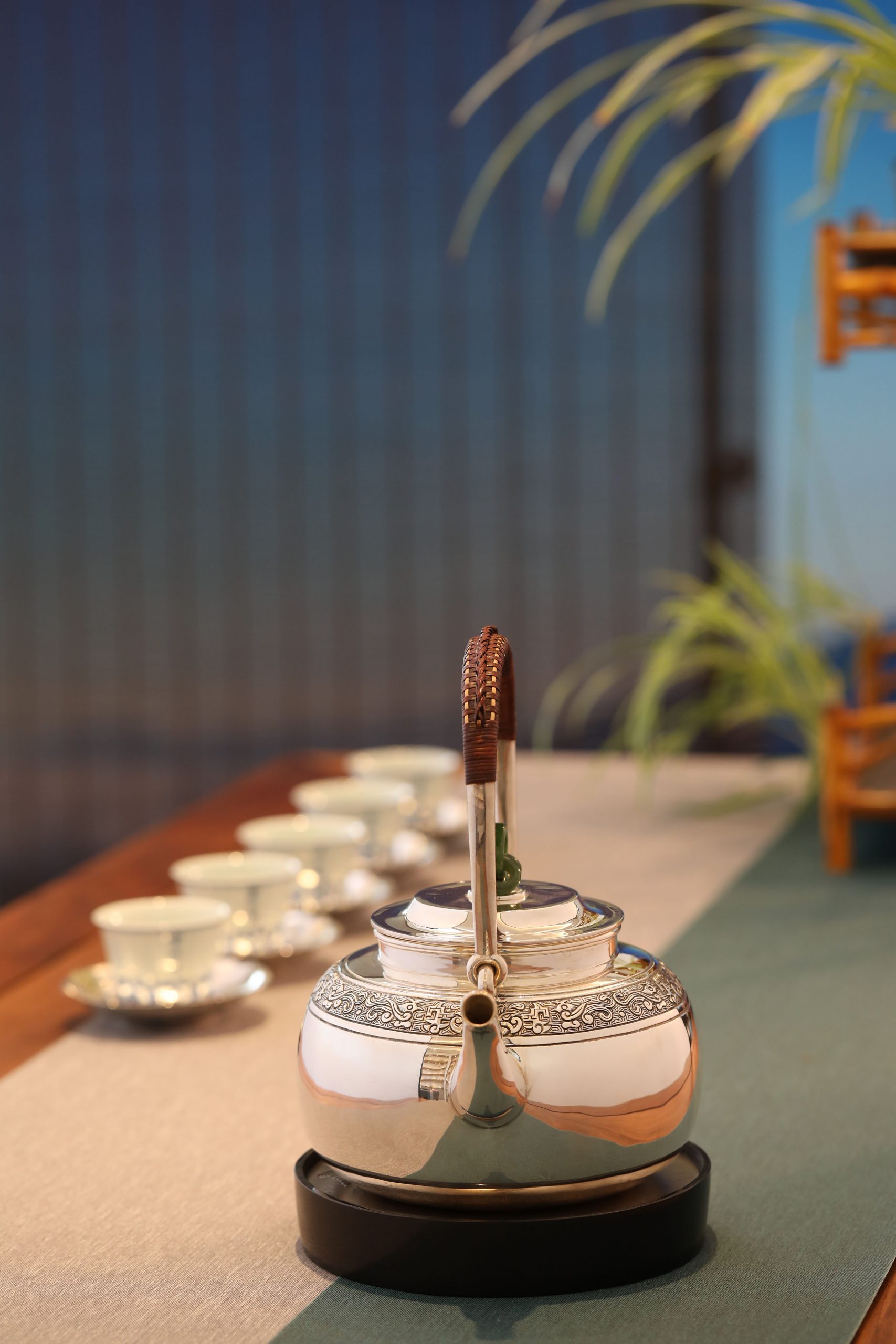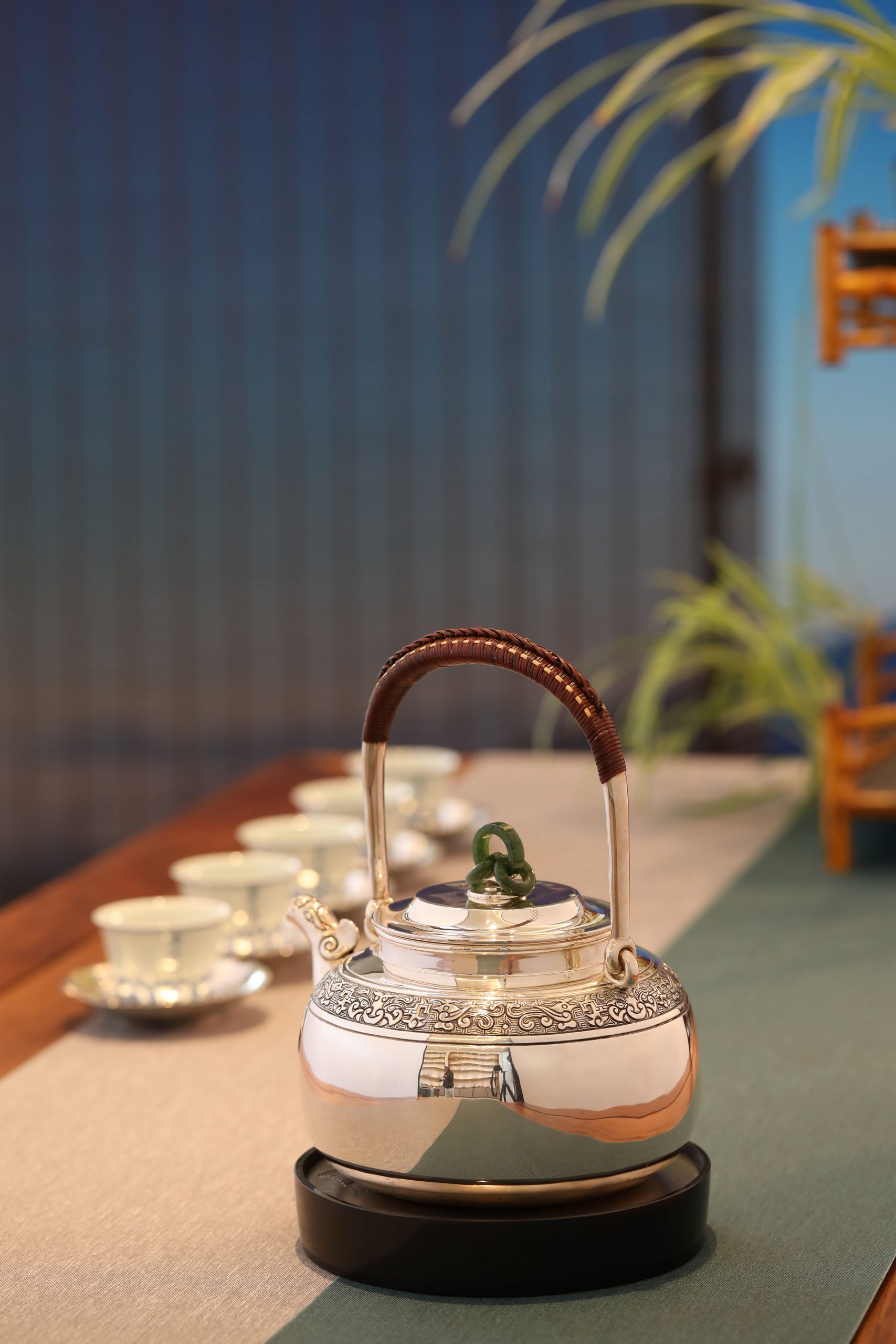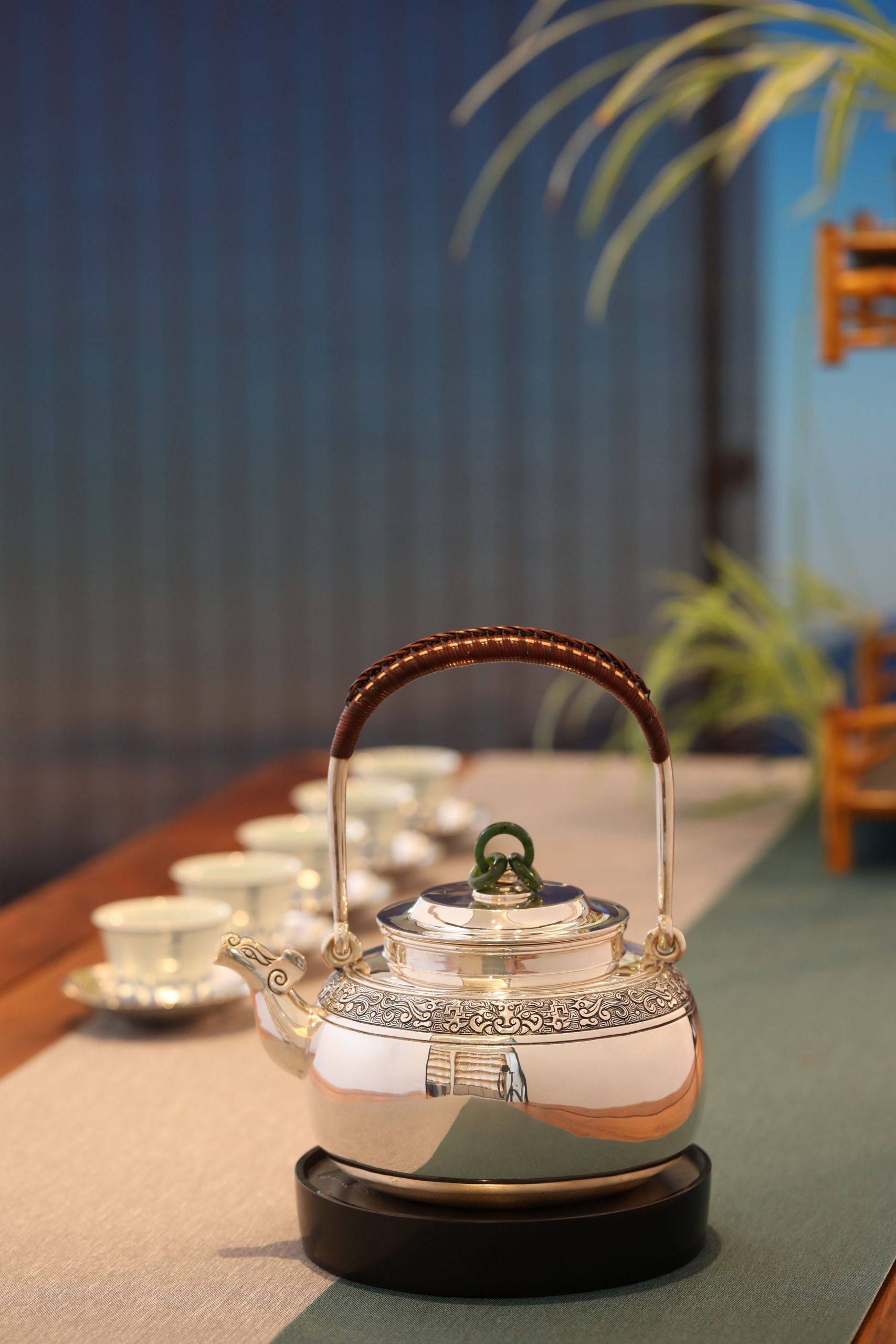 大雅堂出品 纯手工制作。非遗传人李福明代表作。 龙首壶 容量:约1300毫升 克重:约1000克 兽首造型源于春秋战国青铜器,也是最传统的中国纹样。此壶三环玉摘,老藤编把。壶身錾刻精湛,回纹为地,衬托出古雅神鸟纹样。整体造型古韵,雄浑恢弘。大雅堂出品 纯手工制作。非遗传人李福明代表作。