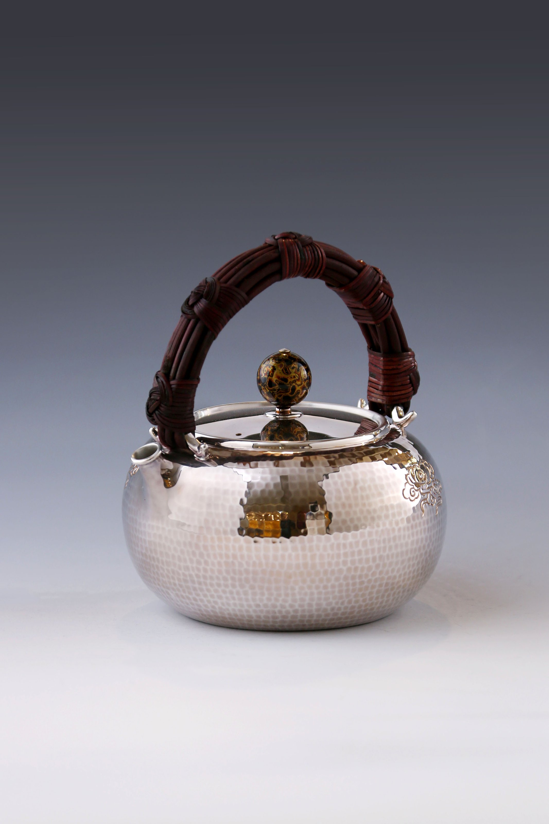 大雅堂出品 非遗传人洪继科 造 祥云如意结银壶 容量:约550毫升 克重:约330克 此器物“一片造”,齐锤锻打,錾刻祥云。老藤把如意结韵味古朴,黑金大漆壶摘。 550毫升的容量可煮茶,可泡茶,可烧水不亦悦乎。