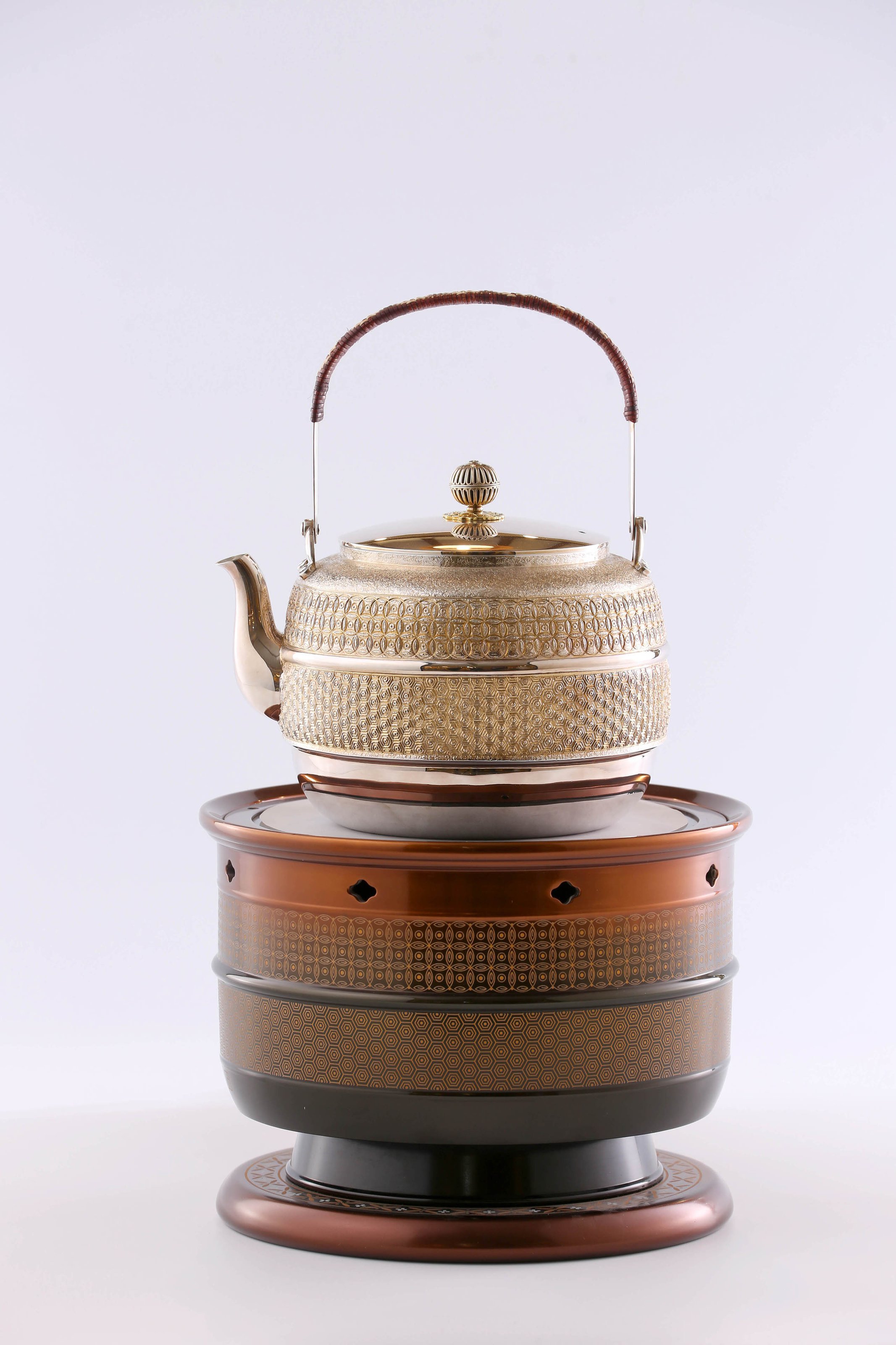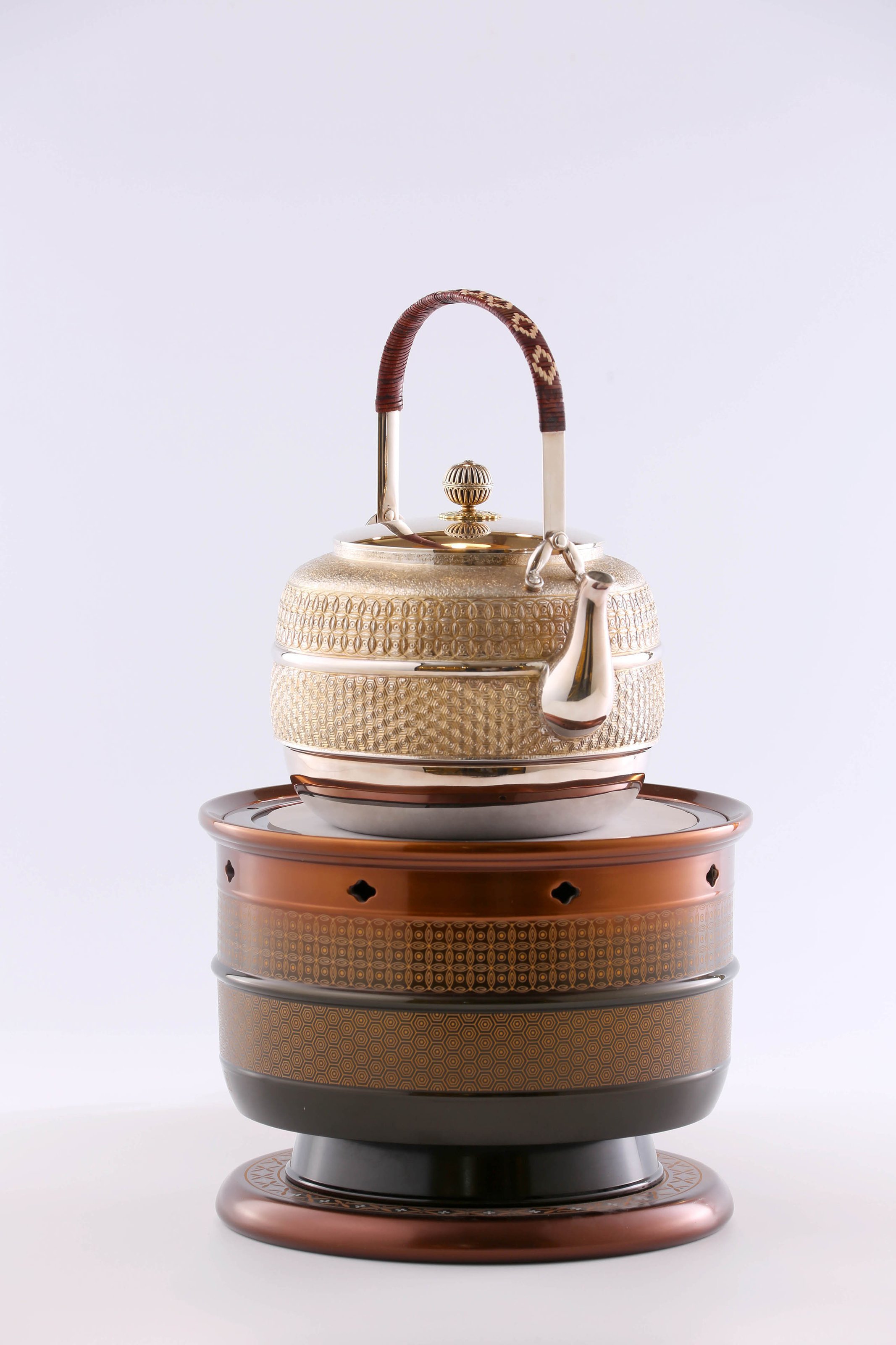 大雅堂出品 银器锻造非遗传人洪继科 造 腰缠万贯银壶 容量:约1200毫升 克重:约570克 壶身造型沉稳恢弘;三弯流口舒朗挺拔;提梁俊逸,老藤编把;金托倒扣菊花壶摘。壶身錾刻钱纹,外圆内方,环环相扣,四方连续;腰线熠熠生辉,金钱绵延不绝。 所配陶炉纹饰呼应,色彩和谐。